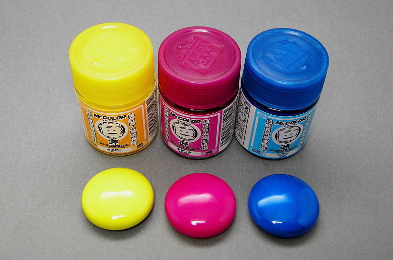雖然名為 “原色”,不過模型漆中所指的原色並非色料三原色(C,M,Y),我發現原色漆中的洋紅偏紅,而青色似乎又太過於藍,唯有黃色表現相同;以我觀察的結果而言,我認為 GAIA 與 Mr.COLOR 兩家應該都是採用「日本色研 PCCS 色相」中的「心理四原色(洋紅、黄、綠、青)」來做為原色代表,因此與色料三原略有偏差。有差嗎?當然有差!
