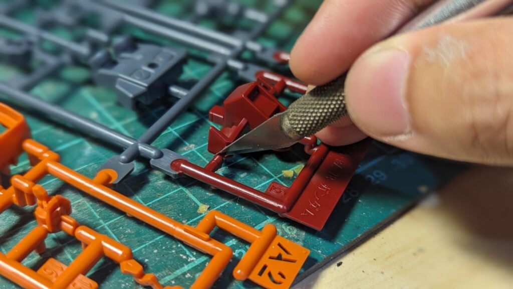 由於EG套件的設計理念是輕鬆享受做模型,湯口設計成讓我們直接用手拔零件,反而沒辦法讓斜口鉗伸進去剪。因此建議大家用長筆刀小心的切下湯口